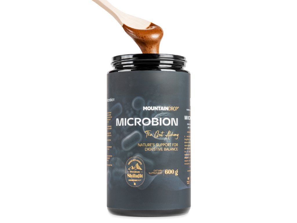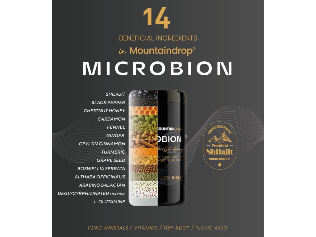 Mountaindrop® Microbion je revoluční přírodní směs, pečlivě vytvořená jako doplněk vyváženého životního stylu a pro přirozenou podporu zdravého trávení. Obsahuje synergickou kombinaci adaptogenů, tradičně používaných rostlin a na antioxidanty bohatého koření. Je navržena tak, aby vytvářela prostředí, které respektuje a je v souladu s vaším mikrobiomem – bez použití vnějších bakteriálních kmenů.
